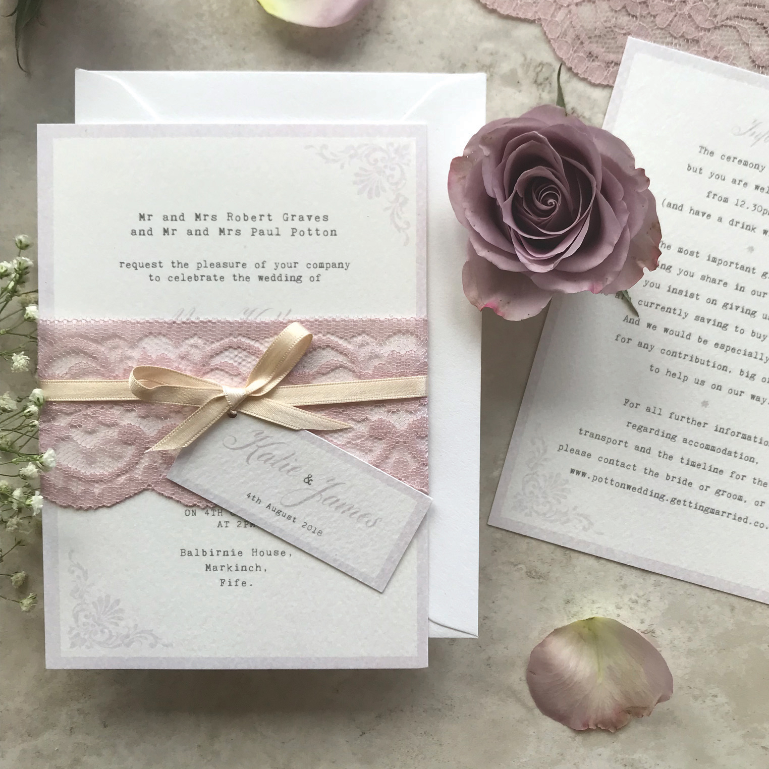 We looked at classic and traditional fonts combining a script and typewriter font to compliment one another. We went with a very clean look to the design adding a pink border and small lace design elements to tie in with the real lace used to create a pretty belly band holding the invite, RSVPs and information together. Finishing off the invitations with a satin ribbon bow and tag with the couples names and wedding date to create the romantic look the couple was after.