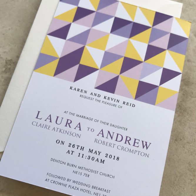 We took a geometrical pattern and then incorporated the couples wedding colours of yellows, purples and pinks. They really liked a pearlised paper which was sourced for them, giving a subtle shimmer to the finished product.