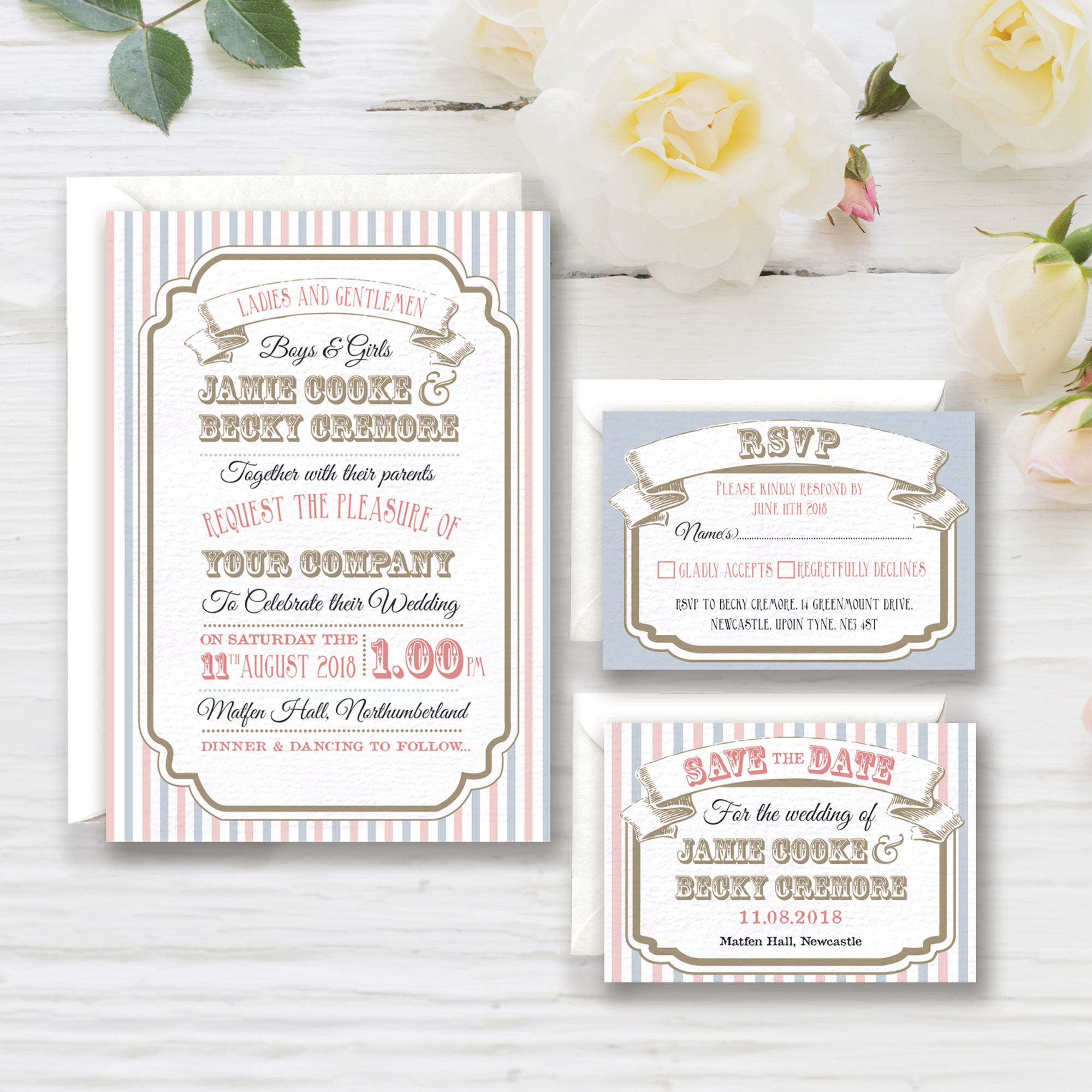 SIZE: Invite – A6 (postcard), Save the date A7, RSVP – A7, Info Card A6