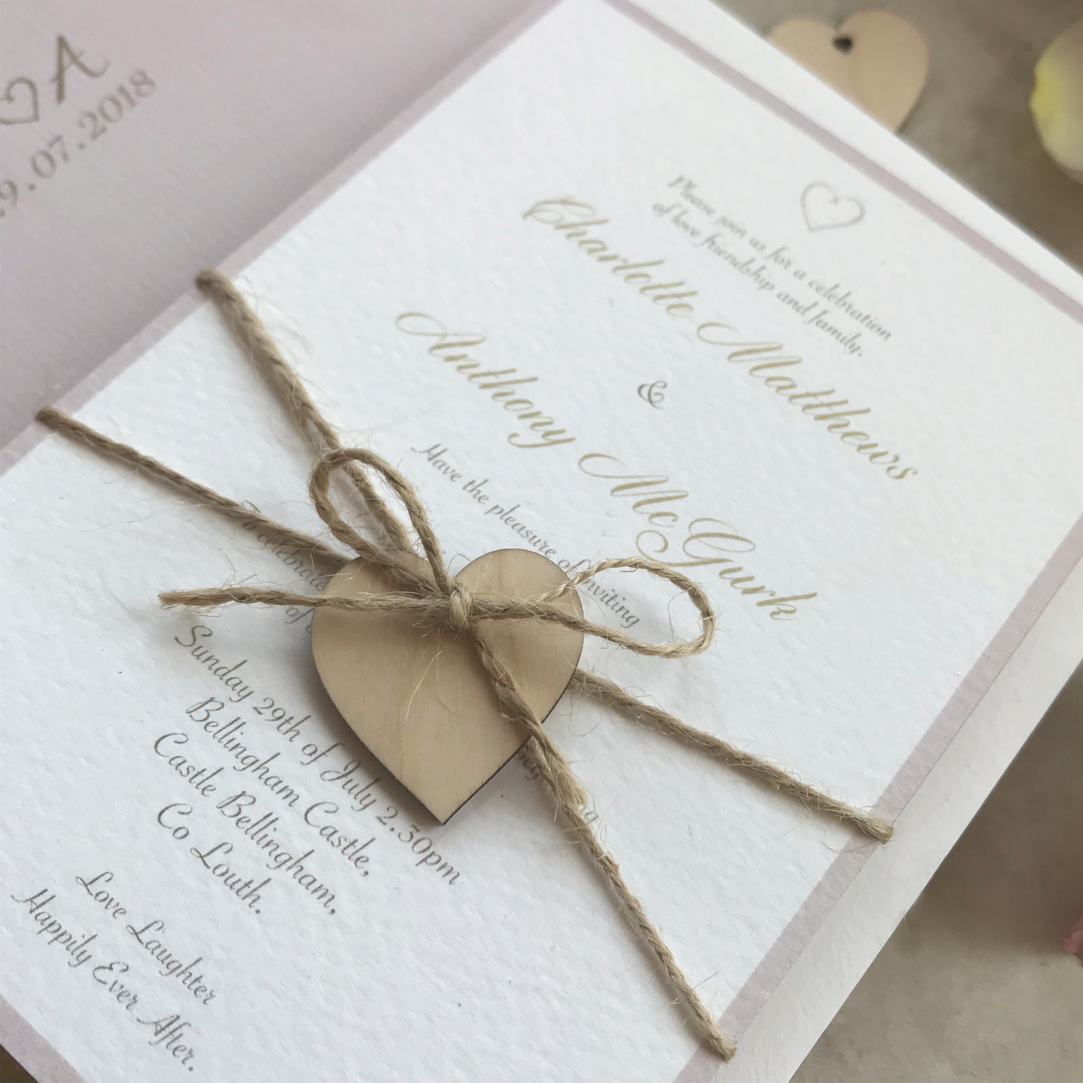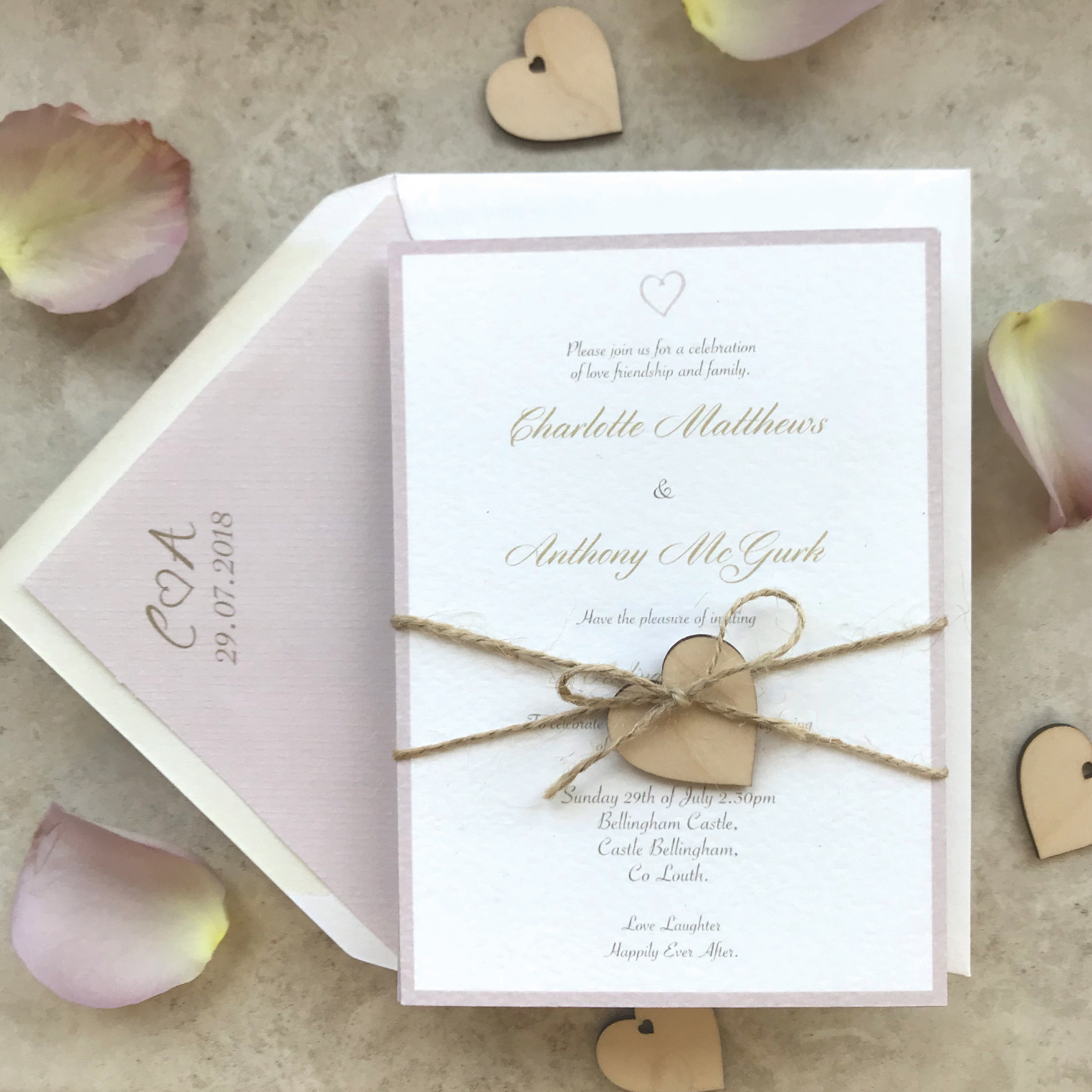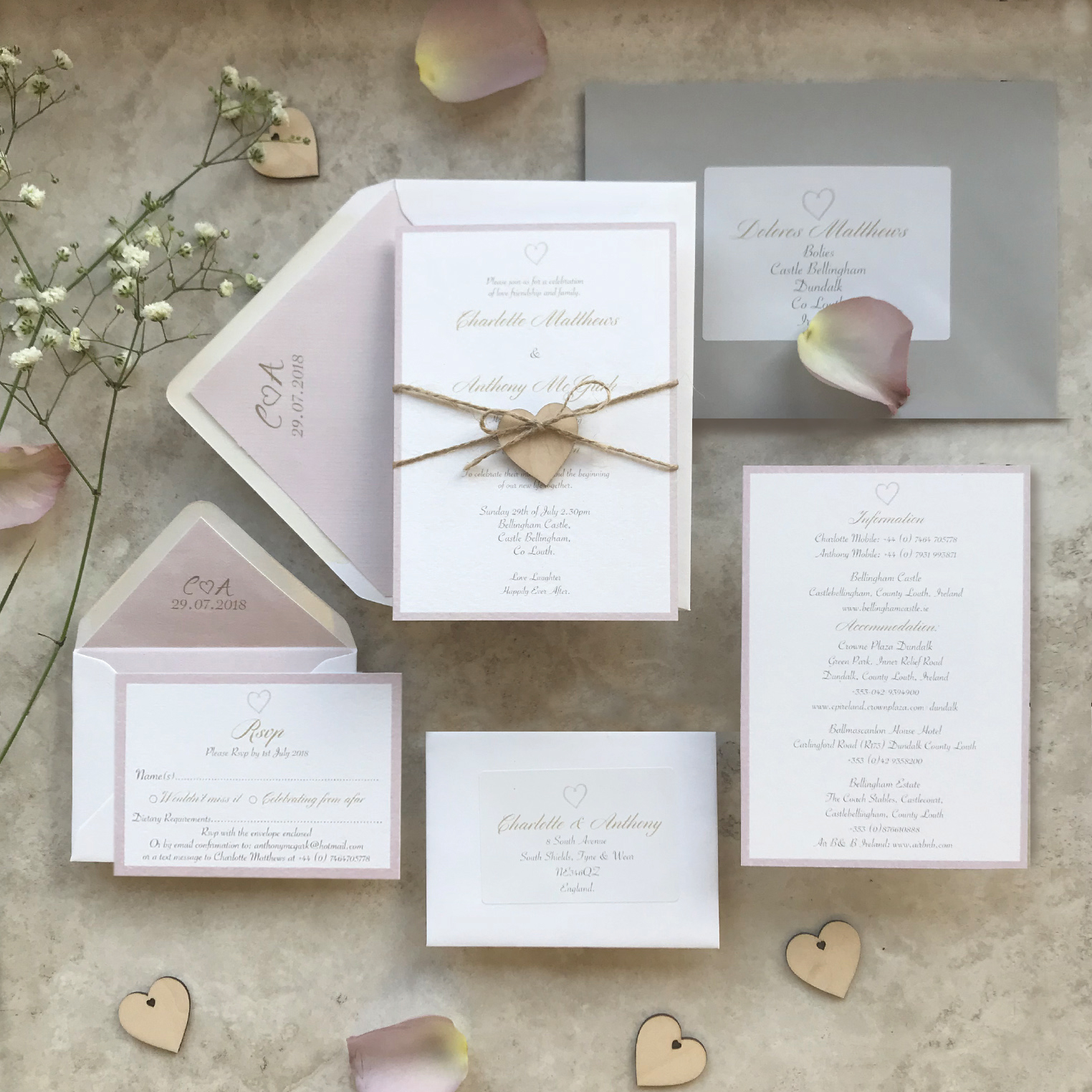 We used Charlotte and Anthony’s wedding colours by introducing a thin blush border on their invites, RSVP and info sheets. Their blush initialled envelope inserts lifted the whole design. They liked the idea of a rustic finishing touch so we came up with the idea of the little wooden heart to attach with twine and package their stationery. This heart motif was carried throughout the entire design to tie it all together.