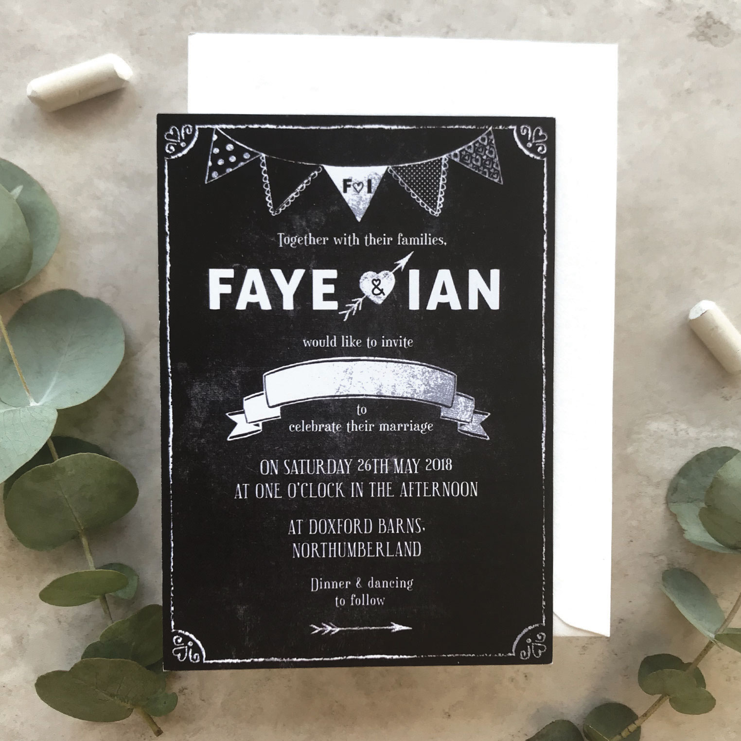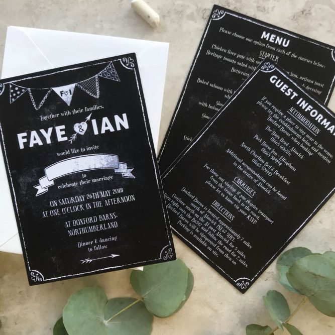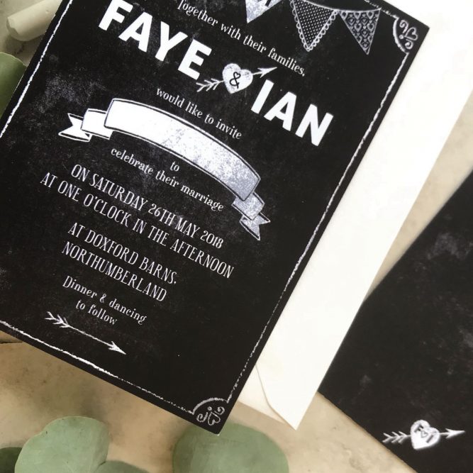 Faye & Ian wanted chalk board inspired invites. The style they had in mind was informal and rustic.