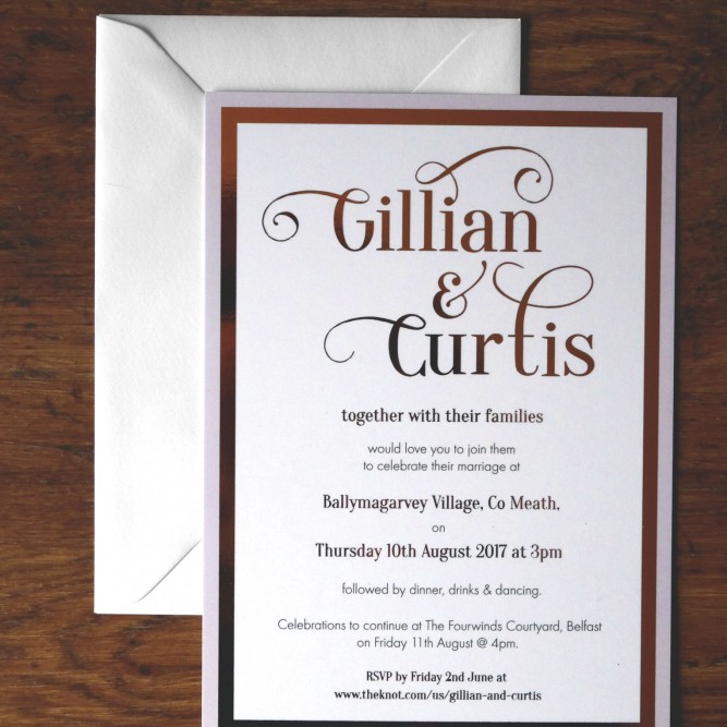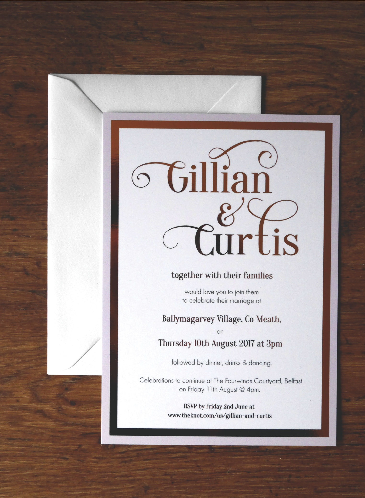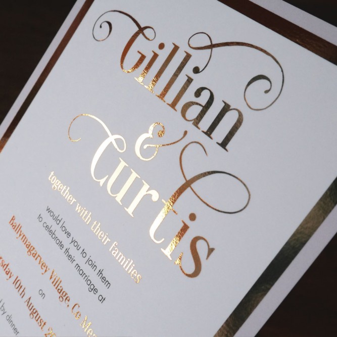 We used a mixture of fonts to create Gillian & Curtis’s wedding invitation. A modern Sans Serif in black for the bulk of the text and a classic Serif font for their names, address and time. We incorporated Swirls and filagree into their name lettering to make the copper foil the focal point. A simple copper foil border and blush pink colour added a sophisticated and modern element to their design.