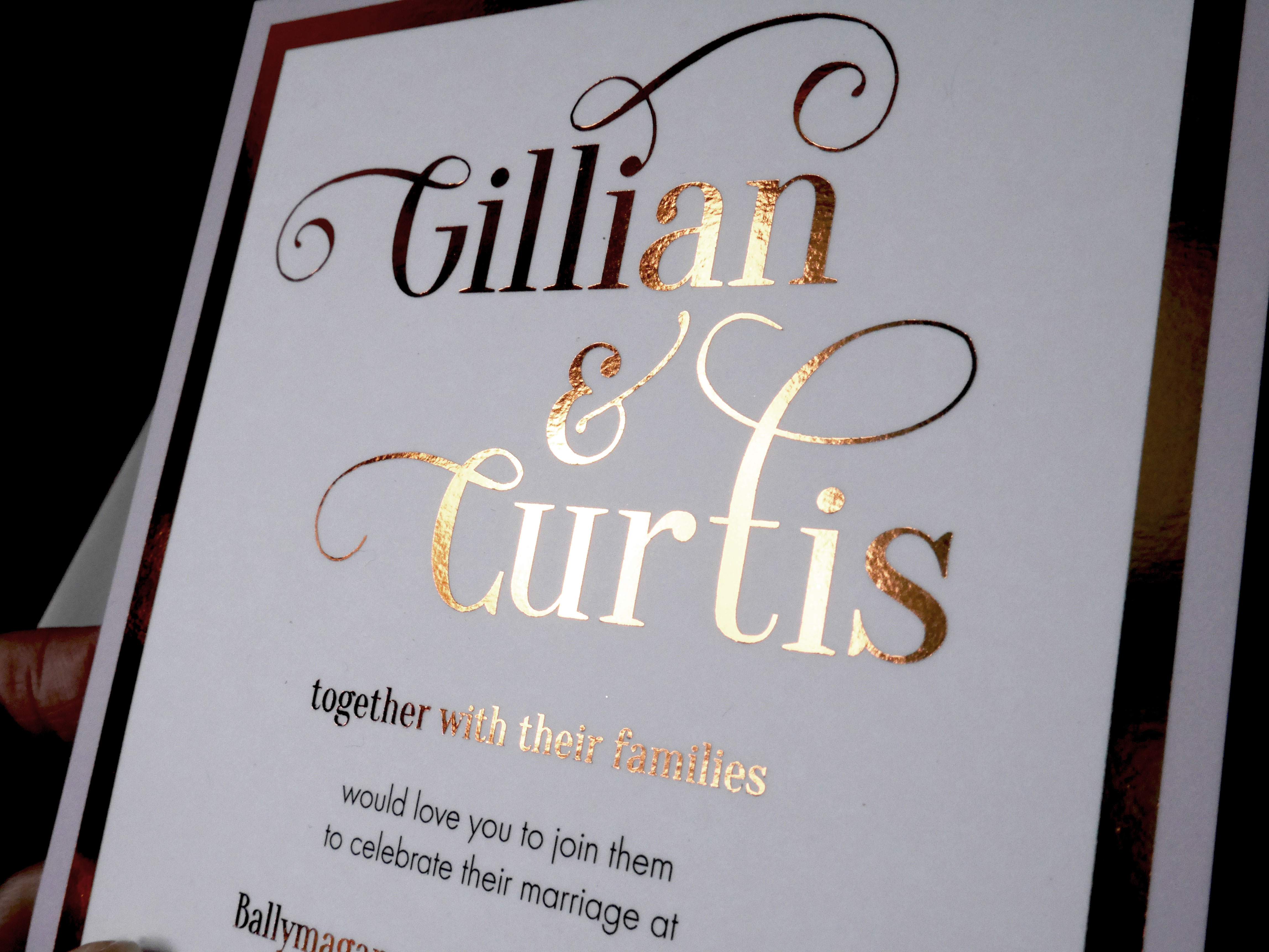 Gillian & Curtis loved the idea of using copper foil with blush pink. They wanted the design to be A5 in size and heavily typographic.