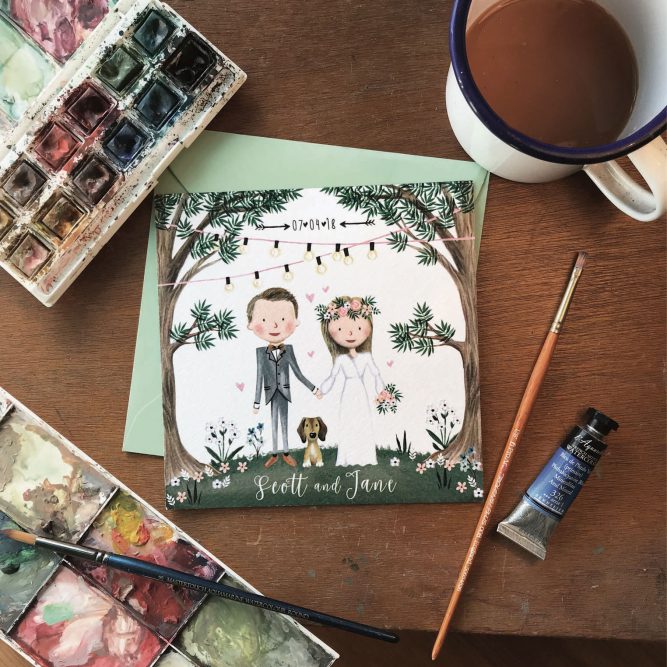 Jane & Scott had a clear idea of what they wanted, they liked the idea of keeping it playful with a cartoon illustration of themselves and their little sausage dog.