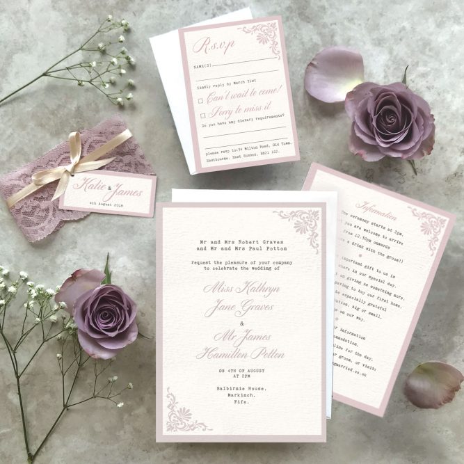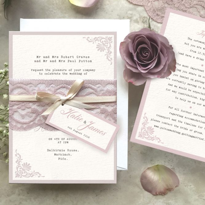 We looked at classic and traditional fonts combining a script and typewriter font to compliment one another. We went with a very clean look to the design adding a pink border and small lace design elements to tie in with the real lace used to create a pretty belly band holding the invite, RSVPs and information together. Finishing off the invitations with a satin ribbon bow and tag with the couples names and wedding date to create the romantic look the couple was after.