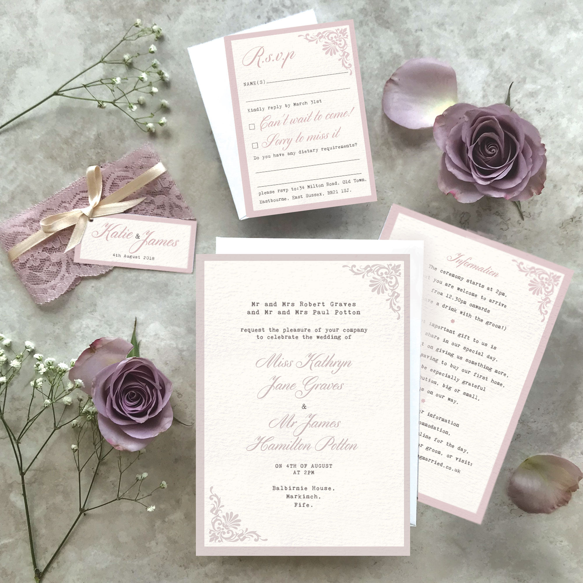 It was great working with Katie and James, they already had a clear vision of how they wanted their invites to look. They wanted us to introduce some pink lace and had a colour pallet of whites and pinks for us to work with. We worked together with them, making sure we included their design ideas and adding some of our own suggestions on how to bring the whole thing together and create something with a romantic and stylish feel.