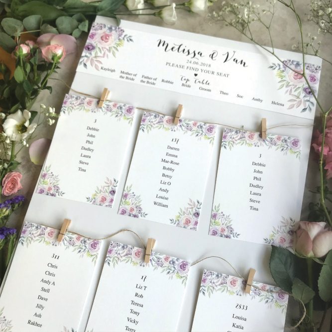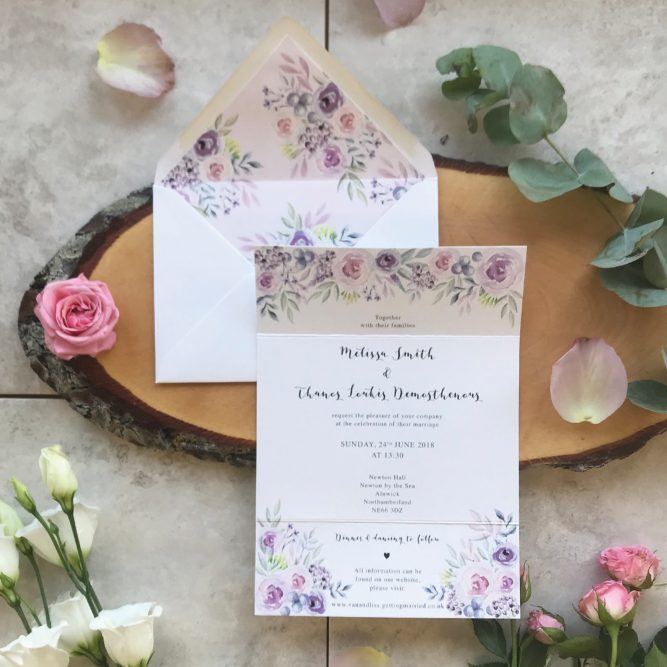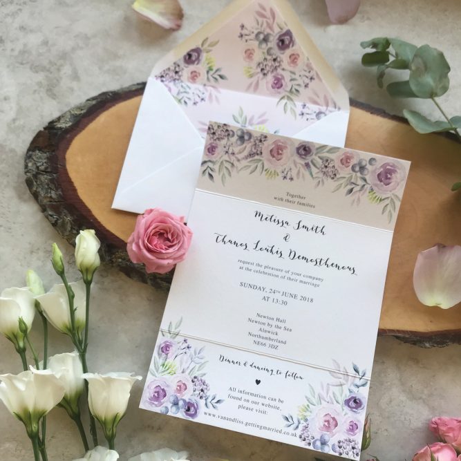 Mel initially asked us to do her save the dates. We then went on to design her invitations and on the day stationery. She seen an existing design on our website ‘Autumn Floral’ and although she loved the content she felt that the flowers and fonts were not in keeping with her upcoming wedding.