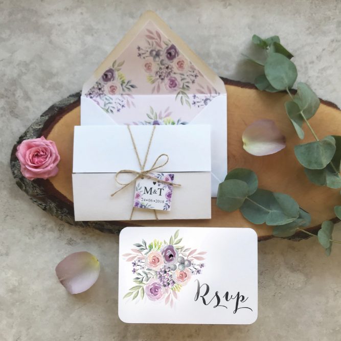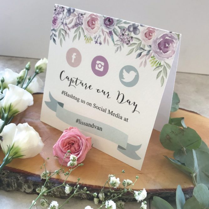 We used the Autumn Floral range as our direction and introduced pastel pinks and blues. Mel was keen for her invitations to look really unique so we decided on a horizontal gate fold. The invite was tied with twine and a small tag with their initials and wedding date. The RSVP was in a postcard format and sat neatly inside the gate folded invitation. We also provided small table name lists for her table plan and a social media sign.