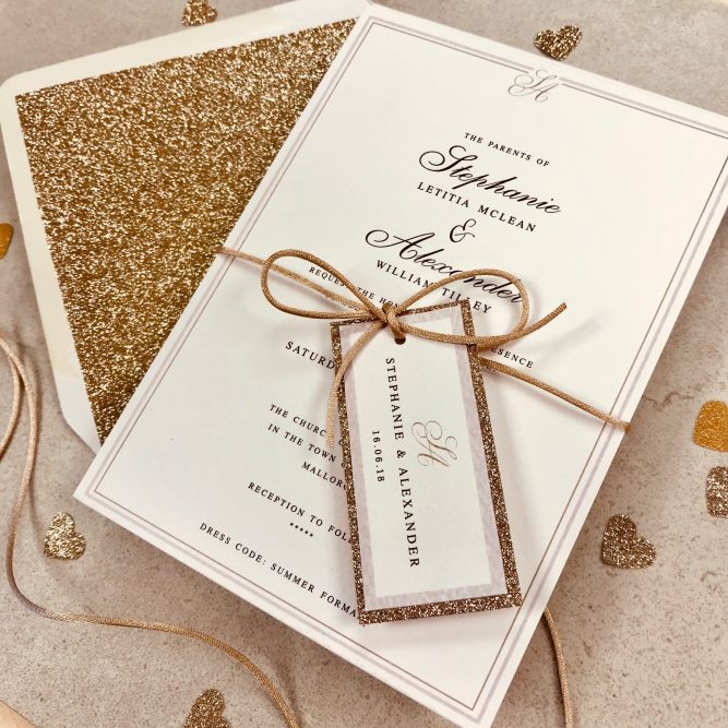 We went with a clean pallet of colours of gold, white and blush pink. To lift it we added some gold sparkle with the small tag around the invites and the envelope inserts.