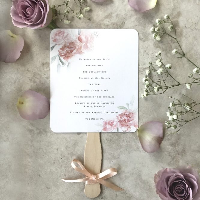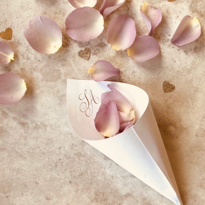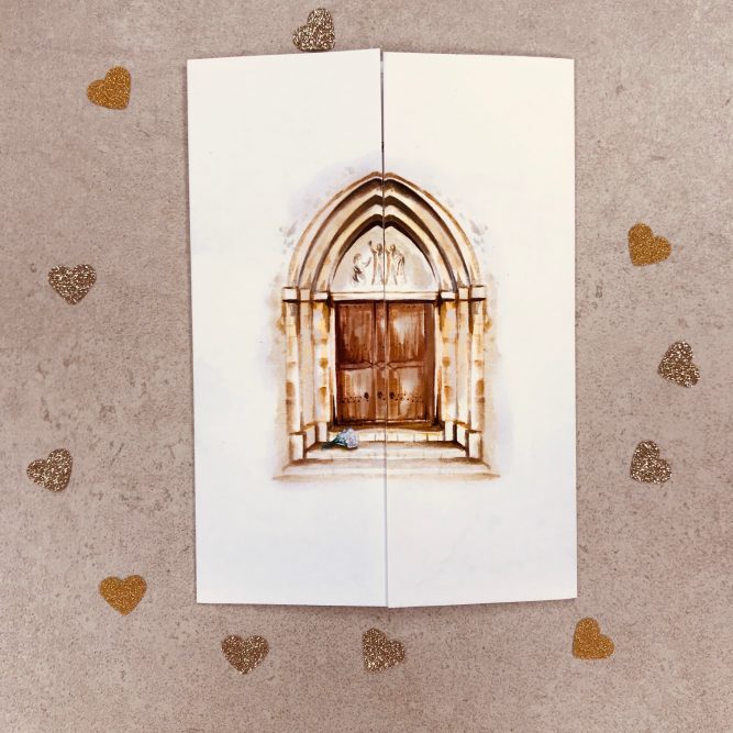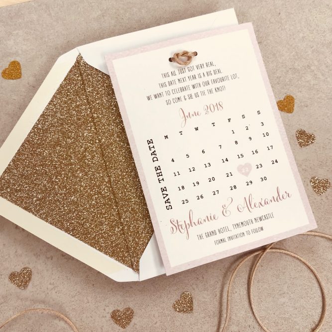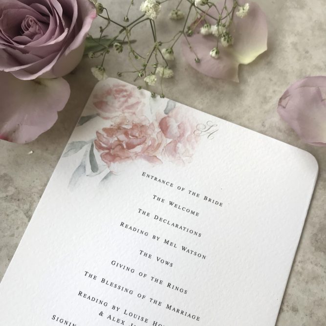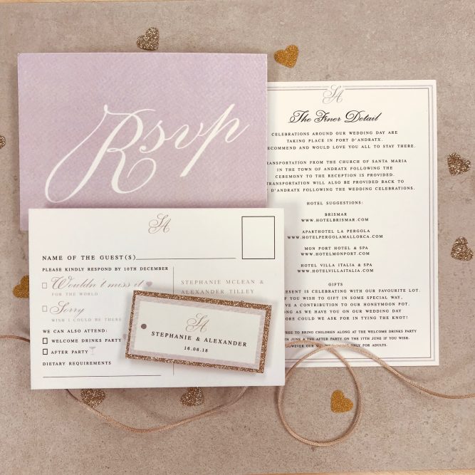 When Stephanie came to meet us she said she’d loved getting Rebecca and Ben’s invitation in the post and said it really set the scene for their day. She wanted something that would give their guests a similar feeling when they received them. They had similar colours with blush and gold, but wanted them to be different from anything we’d done before so we set to work coming up with an individual design for them.