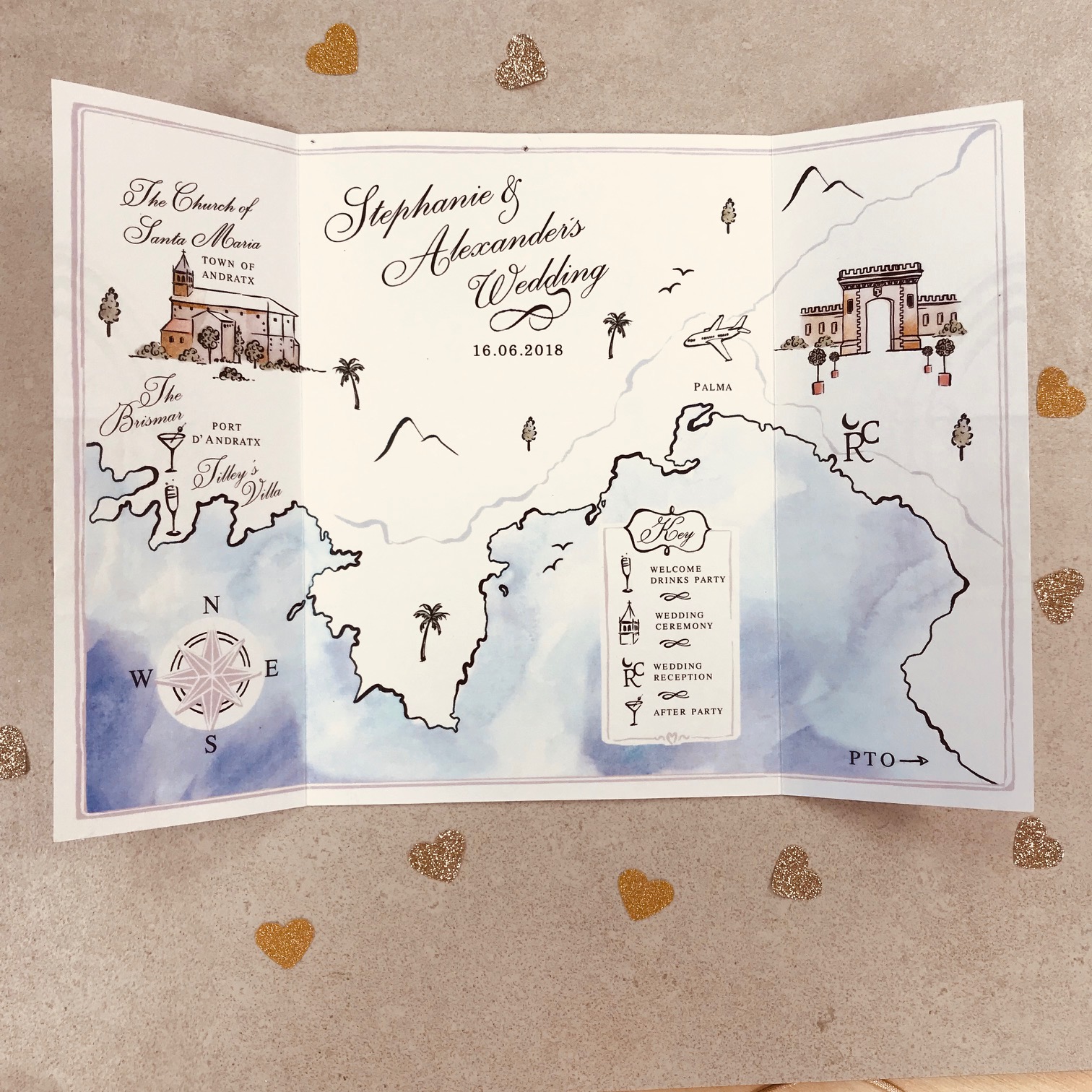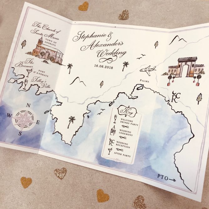 In with the invitation package guests also received a gate fold map of Mallorca showing them all the area’s that the wedding would take place, including welcome drinks, after party, reception and the church. They wanted the invitations to be useful to their guests when the got to the wedding destination, and the map was the perfect addition to complete the package!